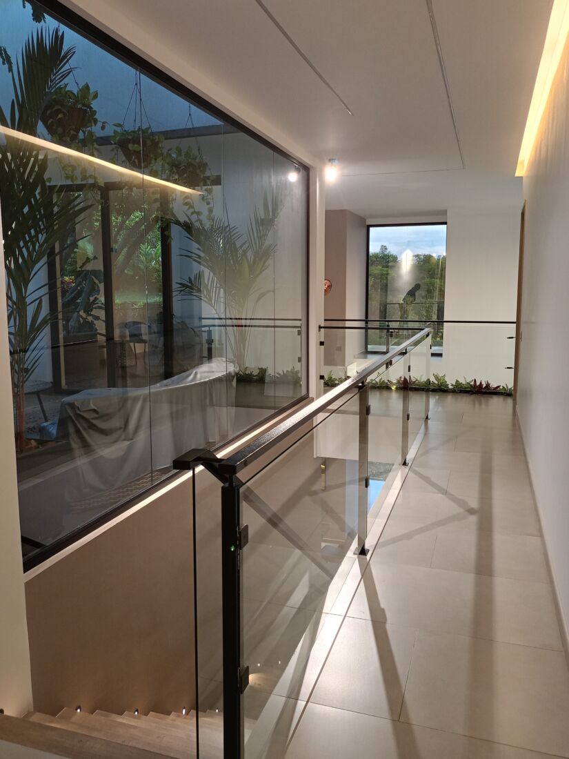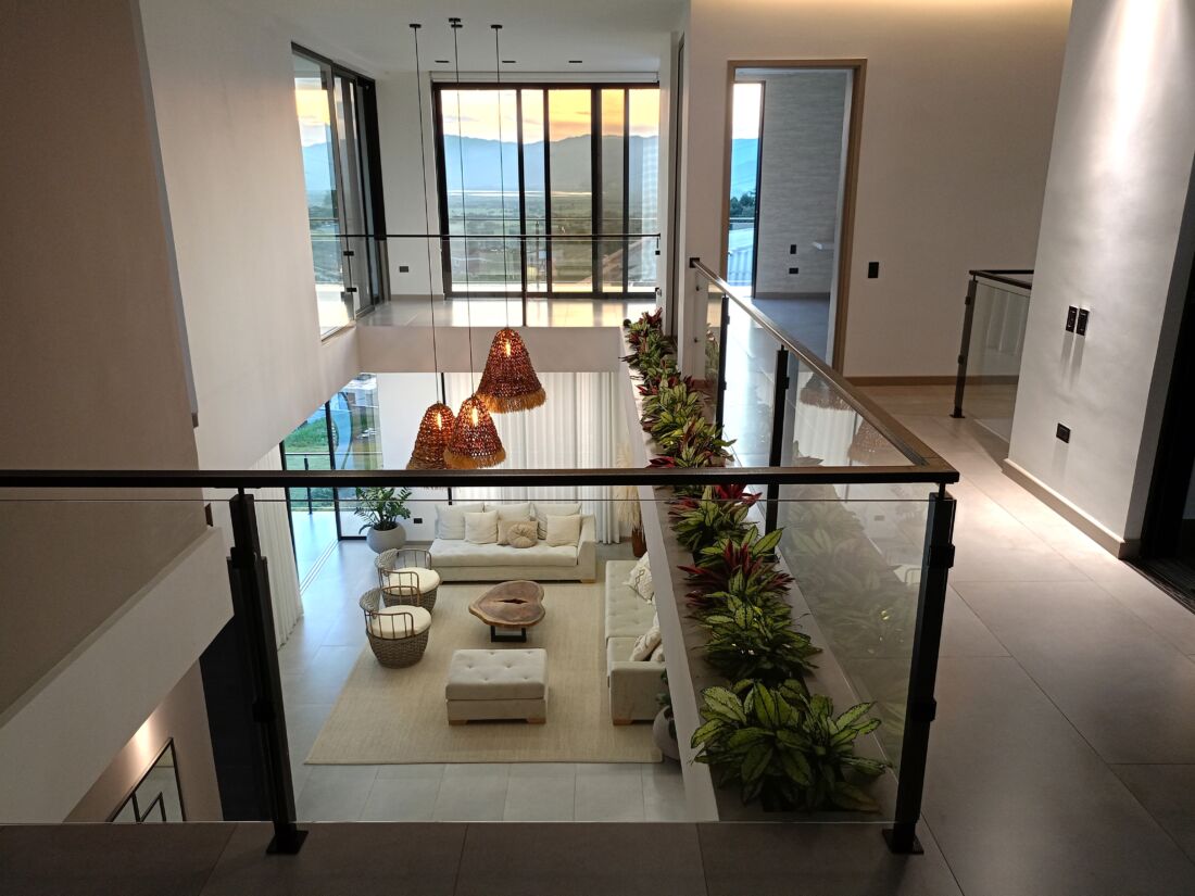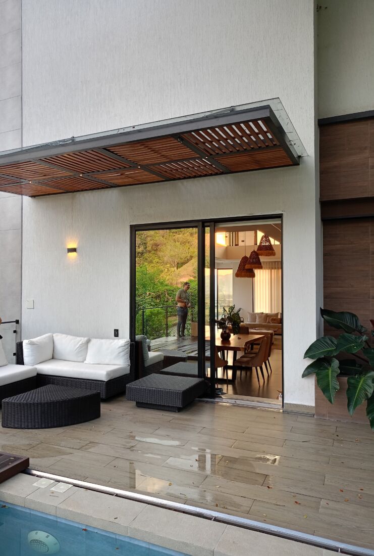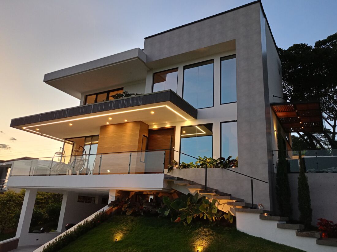 Esta casa, además de ser una vivienda de dos pisos, se caracteriza por tener volúmenes, formas cuadradas y rectas, todos sus espacios tienen amplios ventanales permitiendo ambientes bien iluminados y ventilados de forma natural.