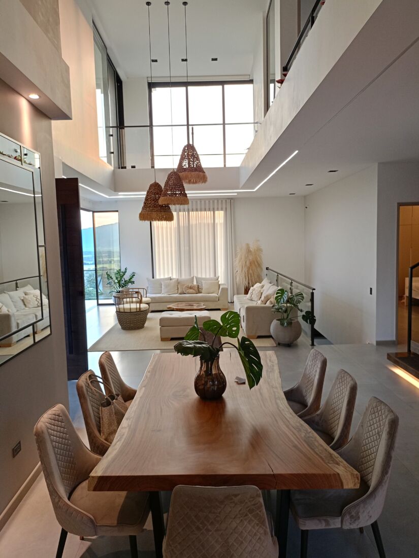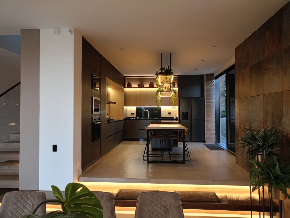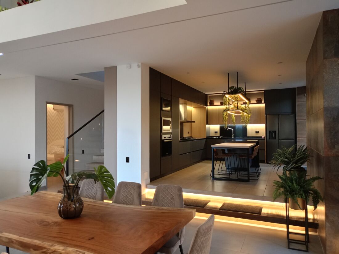 Esta casa, además de ser una vivienda de dos pisos, se caracteriza por tener volúmenes, formas cuadradas y rectas, todos sus espacios tienen amplios ventanales permitiendo ambientes bien iluminados y ventilados de forma natural.